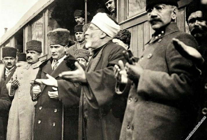 Tarih, 25 Ocak 1923.. Kurtuluş Savaşı zaferle sonuçlanmış.. Demek ki, Mustafa Kemal yanına İstiklal Ordusu’nun destekçisi din adamı alarak, elleri dua eder pozisyonda poz veriyor, demek ki yanındaki İngiliz işbirlikçisi Hilafet Ordusu görevlisi bir din adamı yok.. Bir Milli Kurtuluş Ordusu taraftarı, İstiklal Madalyalı bir din adamı var.
